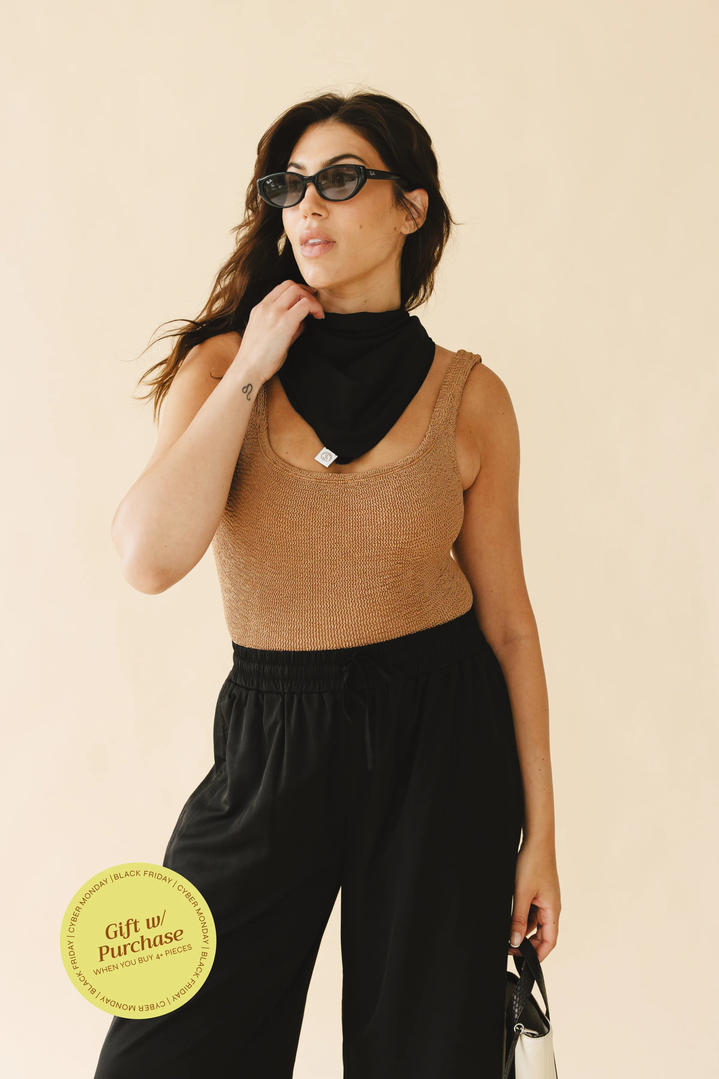 A lightweight square scarf made for stylish, sun-safe coverage on the go.